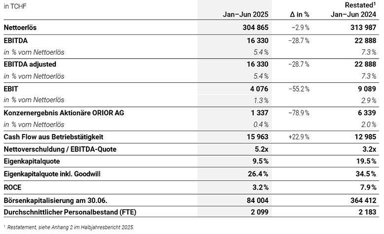 Das Halbjahresresultat 2025 ist noch stark geprägt von den Auswirkungen des Geschäftsjahrs 2024. Die Nettoerlöse der ORIOR Gruppe schmälerten sich im 1. Halbjahr 2025 gegenüber der Vorjahresperiode um –2.9 % auf CHF 304.9 Mio. (1. Halbjahr 2024: CHF 314.0 Mio.). Das organische Wachstum betrug –1.8 %, –0.6 % sind auf den Wechselkurseffekt und –0.5 % auf einen Devestitionseffekt zurückzuführen. Haupttreiber waren der Verkauf der Gastro-Depots von Albert Spiess sowie die Auswirkungen der Ausschreibungs- und Auftragsverluste aus dem Vorjahr. Diese Altlasten drückten zusammen mit den hohen Rohstoffkosten auch wesentlich auf die Rentabilität. Der EBITDA erreichte CHF 16.3 Mio. (1. Halbjahr 2024: CHF 22.9 Mio.), entsprechend einer EBITDA-Marge von 5.4 % (1. Halbjahr 2024: 7.3 %).