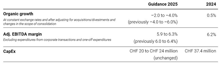 Some of the measures that have been implemented will be completed in the second half of 2025. As a result of slightly better-than-expected organic growth in the first half of 2025 and new innovations introduced to the market, the sales guidance has been adjusted to between –2% and –4% instead of the previous range of –4% to –6%. The planned restructuring at Albert Spiess is expected to influence efficiency in the short term (transfer costs). Furthermore, slight delays in the opening of new outlets at airports (pre-opening costs) will have a minimal impact on the EBITDA margin. Consequently, we are expecting an EBITDA margin of between 5.9% and 6.3% (previously 6%–6.4%).